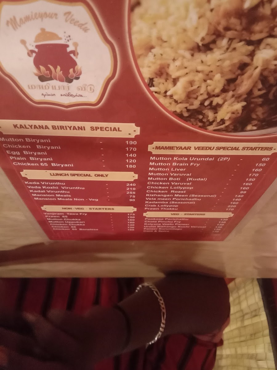 Welcome to Mamieyaar Veedu, a culinary gem nestled in the heart of Triplicane, Chennai. This restaurant invites diners into a warm, family-friendly ambiance, reminiscent of home-cooked meals. The menu here caters beautifully to non-vegetarian enthusiasts with a variety of starters like Chicken Chukka, Mutton Uppukari, and Crab Lollipop, each crafted with authentic flavors that pay homage to Tamil cuisine.